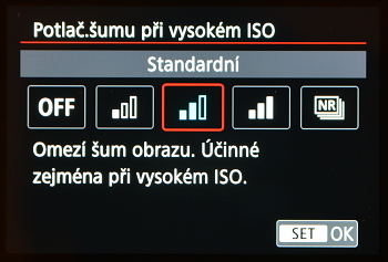 Výřezy výše ukazují, že ISO 6400 je ještě použitelné, při hodnotě ISO 12800 je však již v obraze značný šum a redukce přispěje spíše ke ztrátě detailů. Zleva do prava je redukce šumu na úrovni vypnutá, malá, standardní a vysoká. Tovární nastavení je na hodnotě standardní a lze ji rozhodně doporučit.