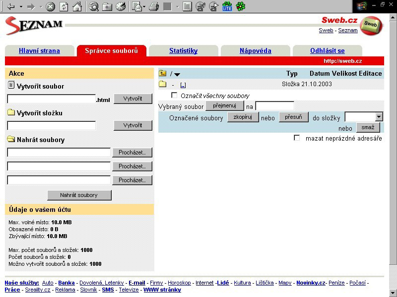 zdarma běžné). Vaše WWW stánky budou mít internetovou adresu http://sweb.cz/jmeno_uzivatele,