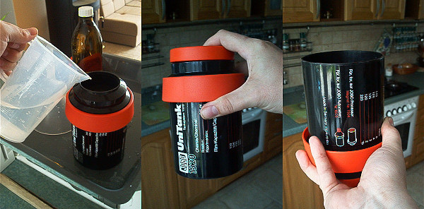 Do odměrky naředíte potřebné množství vývojky. Kolik to je, by mělo být napsáno na každé vývojnici, případně si to předem otestujte nalitím vody známého objemu do otevřené vývojnice s cívkou tak, aby se celá cívka bezpečně ponořila. Ustalovač doporučuji mít v hnědé půllitrové lahvičce. Hlavní je namíchat koncentraci doporučenou pro ustalování filmů a nikdy nepoužívat stejný ustalovač na papíry i na filmy (nejde pochopitelně o značku, ale o konkrétní roztok, který při ustalování papírů kontaminují nečistoty).