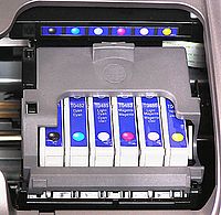 Tiskárna má společný vstupní zásobník papíru jak pro formát 10×15 cm či větší do formátu A4. Po nastavení funkce výměny kazet a odklopení víka jsou přístupné jednotlivé inkoustové náplně.