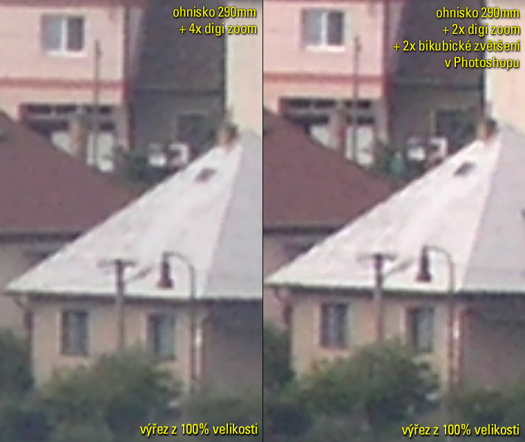 Následující 2 fotografie jsou znovu ukázkou digitálního zoomu a jeho případné kvality oproti dodatečnému zvětšování fotografie ve Photoshopu. V podstatě se mi potvrdila zkušenost z několika předchozích digitálních fotoaparátů, které digitálním zoomem disponují, a to že kvalita digitálního zoomu se zhoršuje od 2× zvětšení. Na první ukázce je výřez z fotografie s nastavením 2× digi zoom. Pro porovnání je hned vedle ukázka výřezu z fotografie, kde bylo použito pouze max. optické ohnisko 290 mm a následně byl snímek zvětšen pomocí Adobe Photoshopu s bikubickým převzorkováním. Z ukázky je patrné, že kvalita digitálního zoomu je výrazně lepší než následné softwarové zvětšení. Snímek je čistší, kresba kvalitnější a jakoby hladší, což někdy může být lepší, někdy naopak na škodu. Dalším příjemným překvapením je, že s použitím 2× digitálního zoomu se velmi potlačila, v podstatě úplně zmizela chromatická vada. Fotografovat s použitím digitálního zoomu však vyžaduje pomůcku v podobě kvalitního stativu, protože již budete pracovat s velkými ohnisky. Na druhé ukázce je to samé, ale tentokráte s použitím 4× digitálního zoomu a tím výsledného ohniska 1160 mm. Zde je již patrné, že výstup, ať již 4× digitální zoom, nebo 2× + zvětšení v PS, je stejný a nekvalitní.