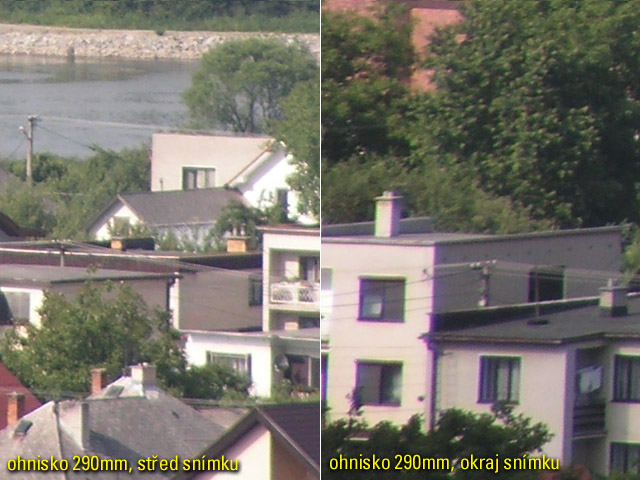 Následující ukázkou je test zkreslení obrazu při nejkratším 36 mm a nejdelším 290 mm ohnisku. Při nejkratším ohnisku dochází k viditelnému soudkovitému efektu, to je třeba mít na paměti při focení architektury a jiných „rovných“ objektů. A bohužel i u nejdelšího ohniska dochází k určitému posunu a to do poduškovitého efektu. Soudkovitý ani poduškovitý efekt není v rozsahu 1/4 až 3/4 zoomu, což je zhruba ohnisko 40 až 200 mm.