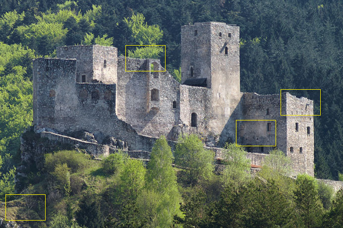 Další fotografie jsou ukázkou toho, co Zeiss umí a co jsem s ním s pomocí Dynax7D nafotil. Fotografie jsou téměř bez úprav, s nastavením fotoaparátu na preferenci clony – A, vyvážení bílé a ISO na automatiku, měření expozice multisegmentové a bodové. První fotografie je vždy ukázkou celého snímku, je zmenšená na velikost 700×460 pixelů, což je asi 23% původní velikosti. Žluté obdélníky vyznačují výřezy ze kterých je pak složena druhá fotografie. Zde jsou výřezy v 100% velikosti. Uvedené vzdálenosti jsou přibližné.