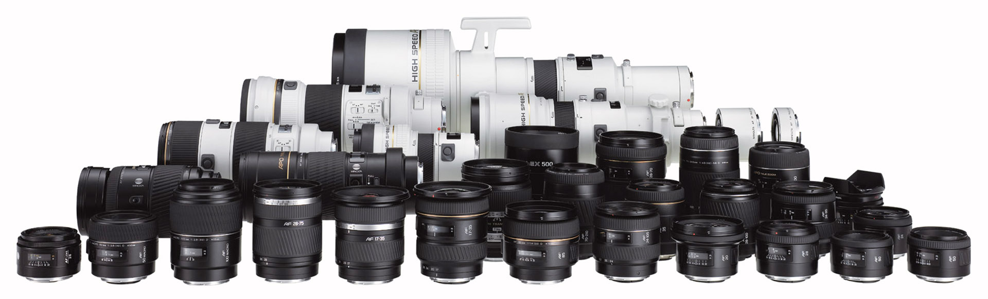 Dynax 5D s mnoha různými objektivy a to v plné velikosti pro lepší