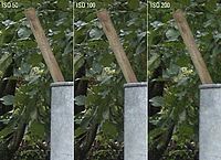 Následující ukázka je porovnání různých nastavení ISO. Kromě již zmiňovaných tří hodnot 50, 100 a 200 ISO, které lze nastavit manuálně, používá automatický režim ještě ISO 80 a 160. Z ukázky je patrné že při ISO 50 a 100 je kvalita výborná, ale při ISO 200 již obsahuje velký podíl digitálního šumu, který by u fotek většího formátu byl již asi patrný. Testované fotografie vznikly v odpoledních hodinách ve stínu stromů.