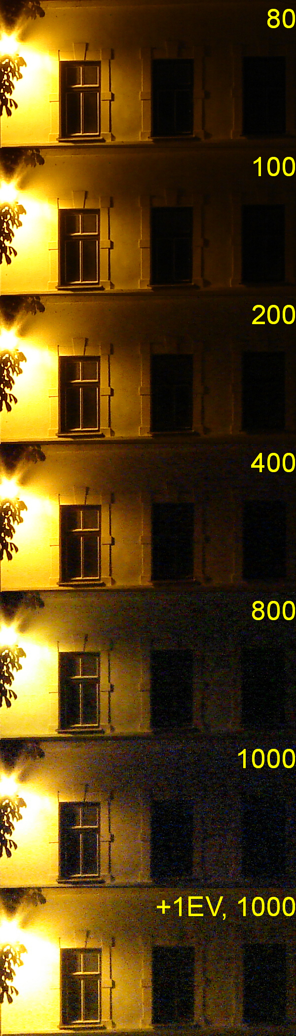 Do ISO400 je pro reálné snímky šum nedůležitý. Projeví se až u ISO 800 a podstatně u ISO 1000. Díky barevnému šumu dojde k mírnému barevnému posunu směrem ke studenějším tónům. ISO 1000 doporučuji použít jen v odůvodněných případech. Originální snímky měly postupně velikost DEN –2,5/2,6/2,5/2,7/2,6/2,7 MB, NOC – 1,9/1,8/1,8/2,3/2,7/2,6/2,6 MB což dosvědčuje práci redukce šumu při ukládání snímku a současně nárůst šumu v tmavých partiích snímku. Středový průměr, automatická expozice, (noc s preferencí clony). Poslední výřez +1EV.