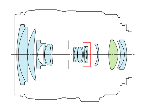 objektivu je složena ze 17 čoček ve 12 skupinách a ekvivalentní rozsah