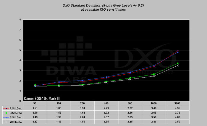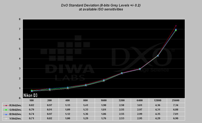 Na obrázku č.15 je graf závislosti míry šumu v obraze pro fotoaparát Nikon D3 v celém rozsahu použitelných citlivostí ISO. Pro přehlednější srovnání a přehlednost jsem přidal i stejné grafy s výsledky, jakých dosáhly konkurenční modely Canon EOS 1Ds Mark III a Olympus E-3, viz obrázky č.15 a 16.