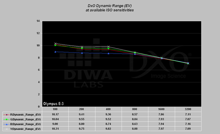 o 1/2 EV) ztrácí, kdežto Olympus se již propadá o zhruba 2 stupně EV.