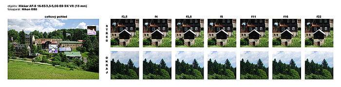 Na „krátkém konci“ podává Nikkor AF-S 16–85/3,5–5,6G ED DX VR dobrý výkon. Kresba uprostřed snímku je už na f3,5 velmi dobrá, ale v rozích je ještě viditelně horší. Rozdíly mezi středem a okrajem se výrazně zmenší až po zaclonění nad f5,6. Od f8 výše se už začíná projevovat difrakce, přičemž ostrost je velmi dobrá až po f16. Po dalším přiclonění je už kresba nevhodná pro náročnější použití.
