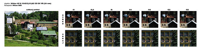 Na 85 mm podal Nikkor AF-S 16–85/3,5–5,6G ED DX VR v reálném použití podprůměrný výkon. Kresba uprostřed záběru je už na „plnou díru“ velmi dobrá a to až do f11. V rozích ale výrazně ztrácí v celém rozpětí clon. K výraznějšímu zlepšení dochází až po zaclonění na f11. Zároveň si můžete povšimnout výrazné chromatické vady na „dlouhém konci“ u testovaného objektivu.