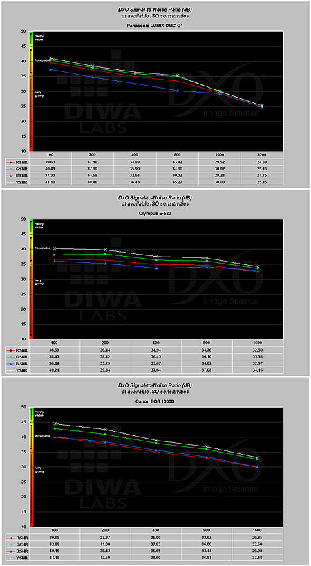 Dalším zajímavým parametrem je odstup samotného obrazového signálu od šumu. Tady je situace jen mírně odlišná. Panasonic má pro nižší ISO odstup signálu větší (lepší) než Olympus.