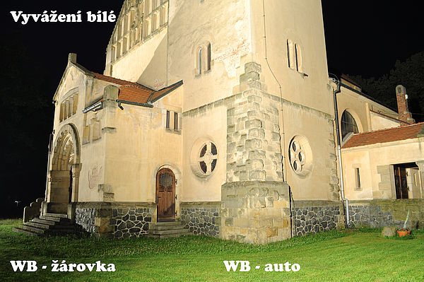 Po laboratorních výsledcích se nyní můžeme podívat ještě na několik praktických ukázek. Na ukázkovém snímku č.15 je celkový pohled na zkušební noční scénu. Snímek je pořízen při citlivosti ISO 100 a je složen ze dvou polovin, odlišných pouze nastavením vyvážení bílé barvy. Jak je patrné, tak rozdíl mezi oběma polovinami snímků je prakticky neznatelný a automatika vyvážení bílé si skutečně velmi dobře poradila s umělým osvětlením scény.