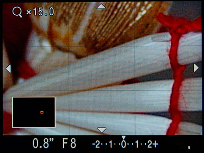 Živý náhled si můžete zapnout i pro kontrolu ostření. Při stisknutí tlačítka Focus Check LV a tlačítka AEL se snímek s plným pokrytím pole zobrazí na LCD. Při dalším stisku AEL se snímek zvětší 7,5× nebo 15× a pomocí kruhového voliče s šipkami si najedete na část, kterou chcete vidět a na ní ručně ostřit, a můžete exponovat. Zvětšení obrazu na LCD neznamená ořez snímku, ten je vždy exponován v plné velikosti. Snad jen malé upozornění, v okamžiku namáčknutí spouště se zvětšení okamžitě zruší, a expozice se tak provede pouze při zobrazení celého snímku.