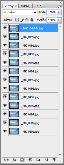 Výsledek obou zmíněných funkcí je stejný – jednotlivé snímky jsou vloženy do jednoho do takzvaných vrstev. Vrstvy si můžete představit jako papírové fotografie naskládané na sobě. První fotografie je úplně nahoře a zakrývá ty ostatní, které jsou seřazeny pod ní. Přehledné zobrazení všech vrstev najdeme na panelu Vrstvy. Aktuální vybraná vrstva je zvýrazněna modře. Kliknutím na ikonu oka v levém sloupci lze vrstvu dočasně skrýt/zobrazit.