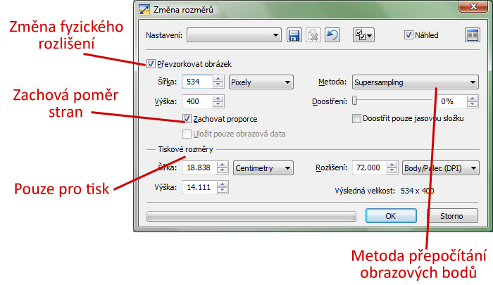 Okno s volbou parametrů pro zmenšení snímku se samozřejmě v různých editorech liší, některé volby jsou ale všude. Při změně rozměrů musíte mít zaškrtnutou volbu Převzorkovat obraz, aby se fyzické rozlišení změnilo, jinak se mění pouze „virtuálně“ změnou údaje o velikosti obrázku v centimetrech a příslušnou změnou dpi (bodů na palec) – s rozlišením to nic neudělá. Podstatná je šířka a výška v obrazových bodech (pixelech), která určuje jednoznačně rozlišení fotografie. Je-li požadavek na snímek 800 pixelů na šířku, není co řešit, prostě napište 800. Ujistěte se, že máte zaškrtnutou volbu zachovat poměr stran (proporce), pak se změní druhý rozměr automaticky, aby nebyla fotografie deformovaná.