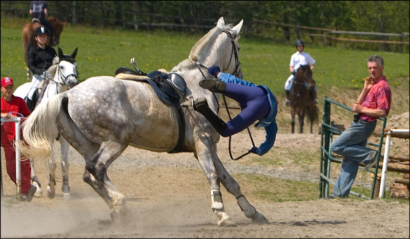 Prostě se TO někdy fakt nepovede.... Ten pán v červené košili je trenér one dívenky, která nedobrovolně opustila sedlo svého koně a jak je vidět, nechává ho tato situace naprosto klidným.....