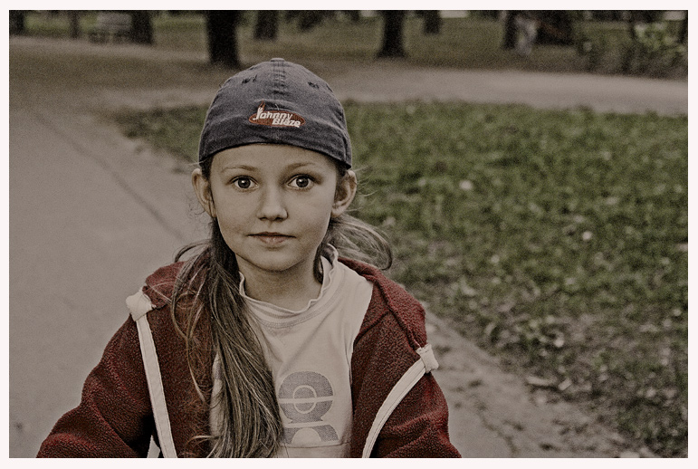 zajímavá barevná úprava; je to hezké; děvče má nádherné oči