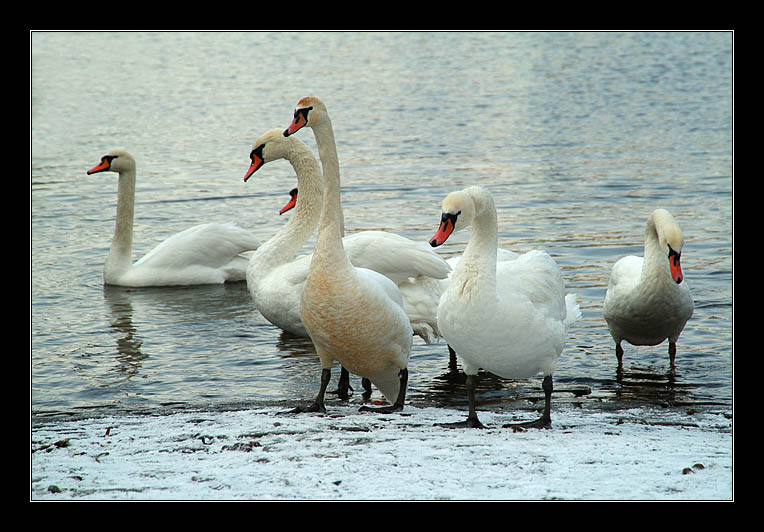 nijak zvlast me ta fotka nezaujala; vyfocená skupinka labutí u břehu ...