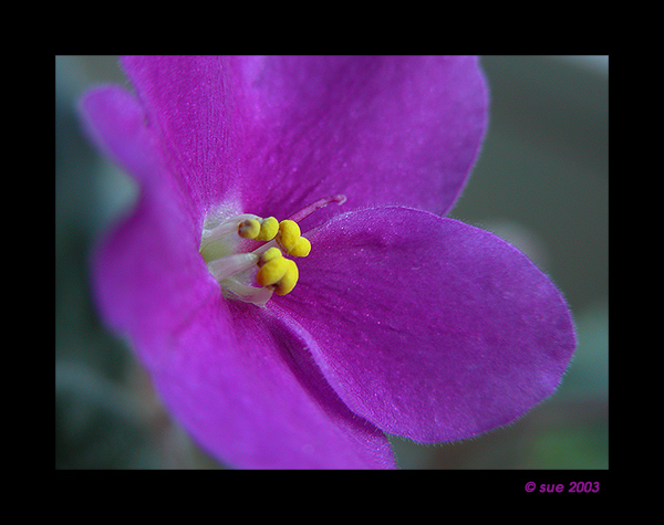 Asi trojcentimetrová hlavička fialky trošku viac zblízka. Práve sa díva z okna.