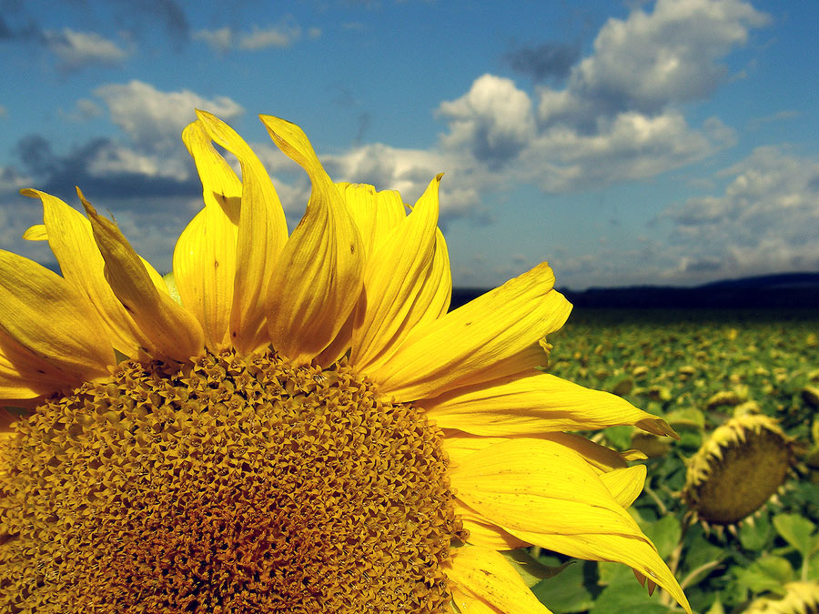Dnes ráno som sa konečne vybral fotiť slnečnice, avšak keď som došiel na pole, zistil som, že už je neskoro a všetky sú už odkvitnuté a čakajú už len na zber, až na túto poslednú ktorú som zazrel v strede poľa. Tak som sa k nej predral a spravil pár záberov. Tuto je jeden z nich. Je to fotené malým automatom Olympus SP700, vďaka za každý vecný komentár, či radu