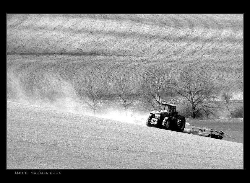 neni to zlé.. jednoduché línie vzadu + stromoradie dávajú fotke kvalitný krajinársky základ + dym a prach zas vytvárajú výbornú atmosféru.. nad tým umiestnením traktora by som ale váhal, dosť sa totiž "bije" so stromami v zadu, chcelo by to nájsť iné stanovisko, aby sa neprekrývali..celé by som to trochu podexponoval..