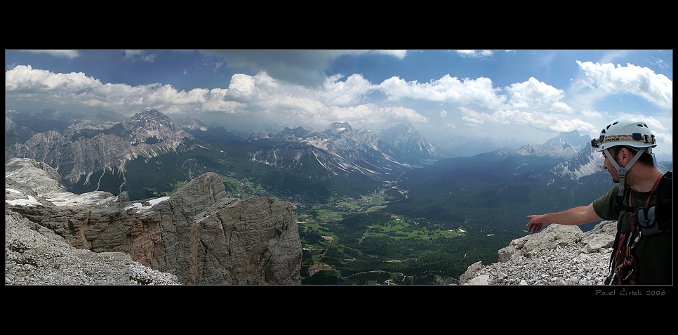 Dolomity - výstup na Punta Anna po zmiňované ferratě (Aleš ukazuje dolů na Cortina d'Ampezzo). Hezký večer.