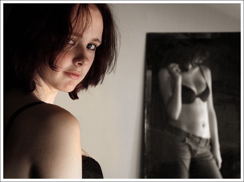 zajímavý je, že jsme fotili přes tři hodiny před černym plátnem a se zrcadlem nikdo nepočítal dopředu. zrcadlo bylo zkrátka jen tak bokem položený u zdi, protože je v pokojíku na půdě trochu nepořádek a jinam se nevešlo. Takže ta fotka vznikla vlastně tak trochu spontálně... :))
