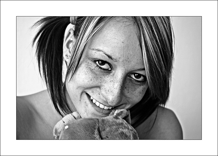 super výraz, a perfektní pihatá tvář :), jen ten medvidek je nejaky mazly :(