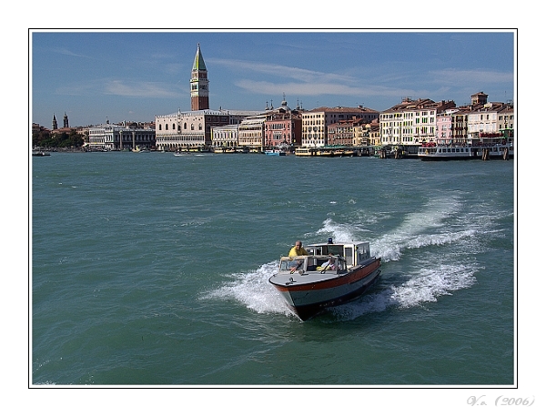V dáli je dobře vidět věž Svatého Marka (San Marco), Dóžecí palác a Mostem vzdechů přimostěna věznice. Tu proslavil svým pobytem mj. G.Casanova