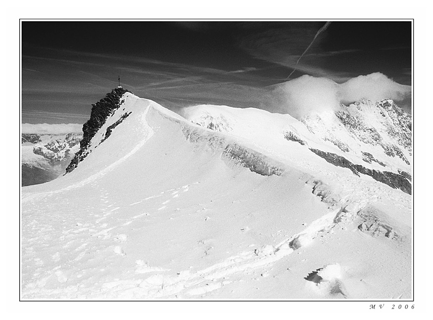 to Pavel Fröhlich: Walliský Alpy - Alalinhorn, skupina Mischabel v okolí Saas Fee (za kopečkem Zermatt, výhled na Matterhorn, Monte Rosa atd.; za dobrýho počasí celkem pohodovej vejšlap, snad jen, že se už trošku hůř dejchá, ale to k tomu patří... vřele doporučuju;))