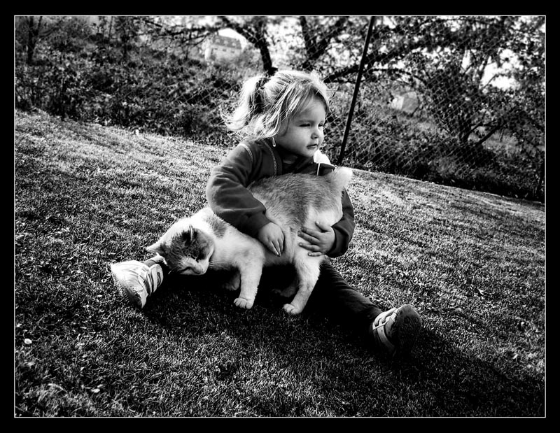 Mám menšie výhrady ku kompozícii. Je to na stred. Ten naklonený horizont nekorešponduje s pohodovou atmostérou. Dievčaťu vyrastajú z hlavy konáre. A ten drátený plot to zabíja. Hodil by sa výrez a pozadie rozostrieť.