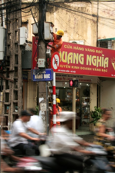Tento zaber jsem zachytil na ulici Hang Bac (psane na modre ceduli) System vedeni elektriky v Hanoji je taky tak zmateny, komplikovany a i specificky jako ta hanojska doprava. System byl zabudovan uz z doby kolonie francouzske (zhruba 130 let zpatky). Spoustu dratu, stare i nove.. pouzite i nepouzite. Byt elektrikar v Hanoji opravdu neni takvao sranda! :)