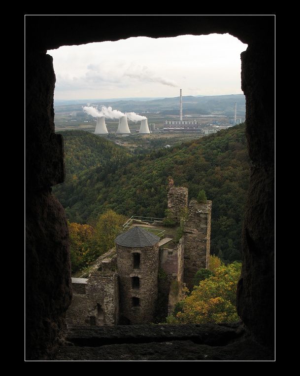 výhled z okna věže hradu Hasištejn na Prunéřovské elektrárny