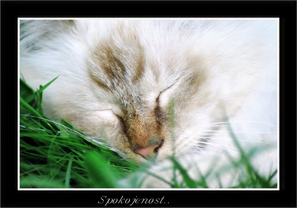 zjemni ten bílý rámeček,stačí 1 px,kočka je hezká, ale kompo je středové,zkus čumák umístit do zlatého řezu,nejlepší by to bylo bez tráva,jen čumák v bílé srsti, ale to už chci asi moc,že?!