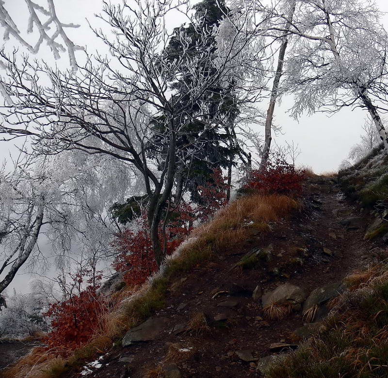 Líbí se mi kontrast ještě podzimních barev k těm zmrzlým stromům. Dnes jsem byla na podobném místě a tam je už všechno zmrzlé, po podzimu ani památky.