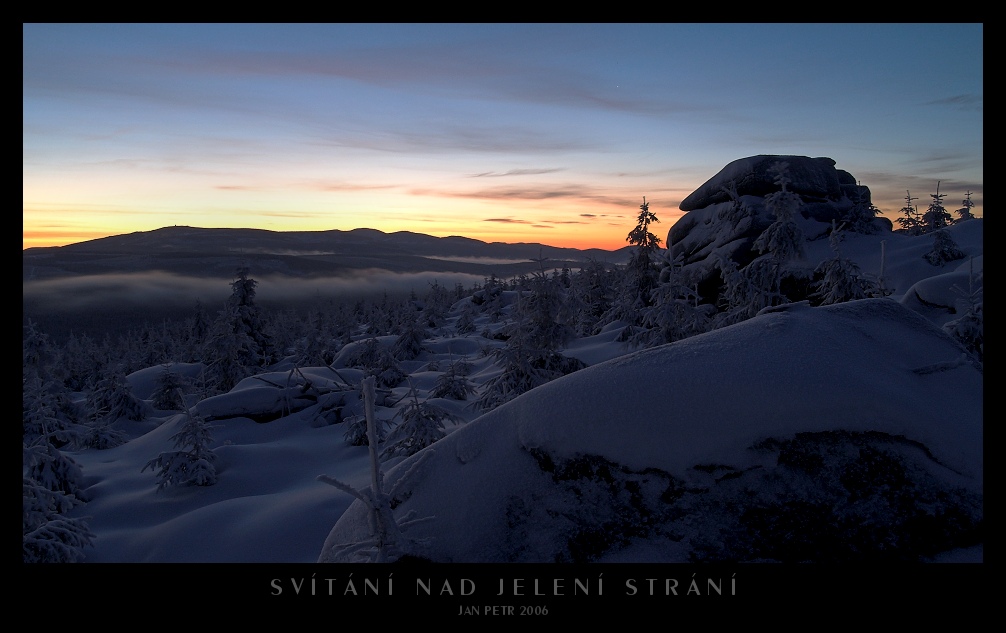 Foto z dnešního rána na Jelení stráni v Jizerských horách. Pohled směrem na Krkonoše.