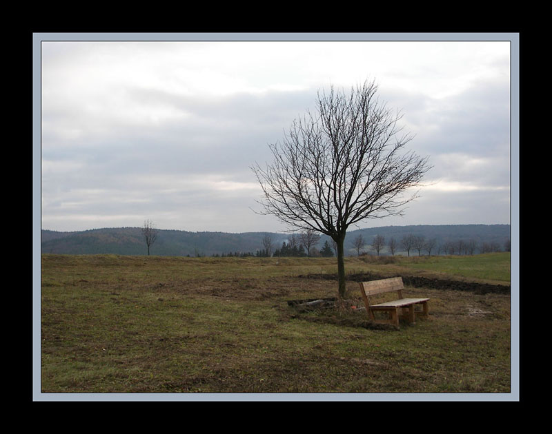Není to zlý, ale zkusil bych to komponovat co nejvíc od země, aby zmiznuly ty kopečky a na fotce tak zůstala jen lavička se stromem.