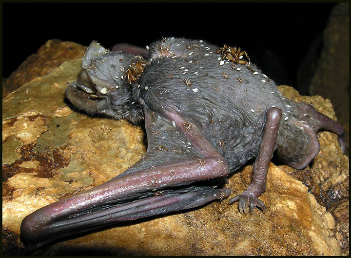 Mláďa netopiera vypadlo matke, ocitlo sa na chladnej zemi jaskyne cca 200 m od vchodu a už sa stalo potravou roztočov (Mezostigmata - tie malé čudá) a múch z rodu Nycterobiidae (tie veľké čudá). Nešlo mi ani tak o kvalitu ako o dokument kolobehu hmoty hlboko pod zemou.