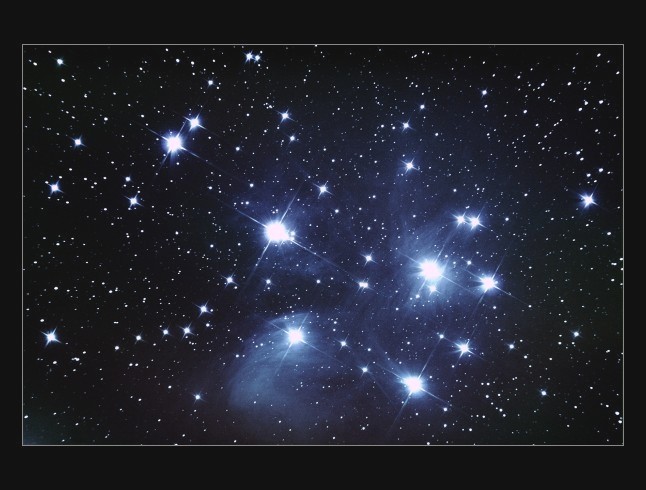 Královny podzimní noci (Plejády, Kuřátka, v reflexní mlhovině M45).