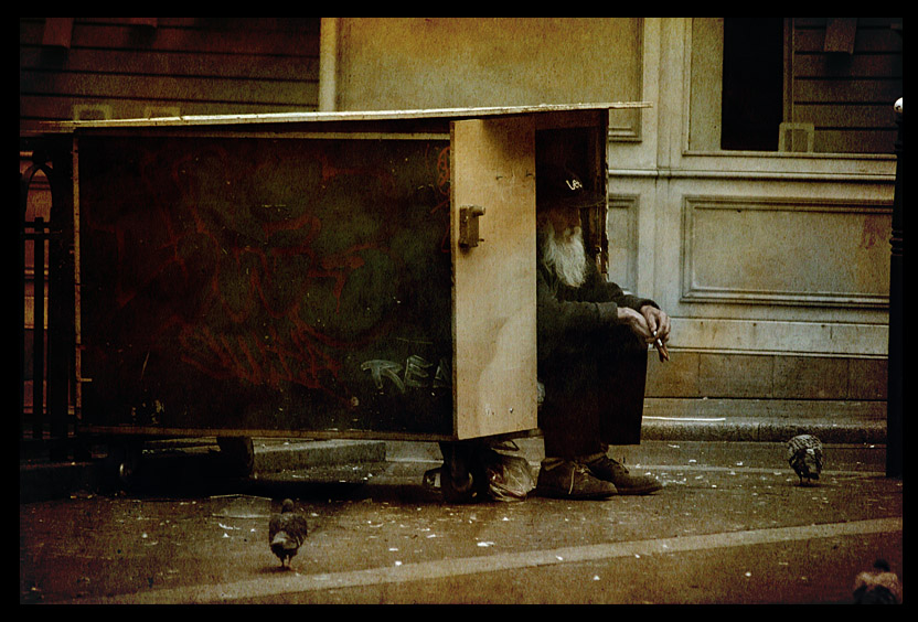 Muž bez domova žijící v této malé boudě v Paříži. Po rozpravě s ním jsem zjistil, že jeho jediný smysl života je krmění ptáků pečlivě nařezanými kousky sušenek a chleba. Odmítl můj dárek, který jsem mu chtěl věnovat hned po vánocích - krabici belgické čokolády. Raději přijmul balíček sušenek, kterými mohl krmit ptáky. Navenek se zdál být šťastný, ale uvnitř tomu jistě tak nebylo. Vídám ho na tomto místě pokaždé, když jdu kolem. V mrazu, dešti...