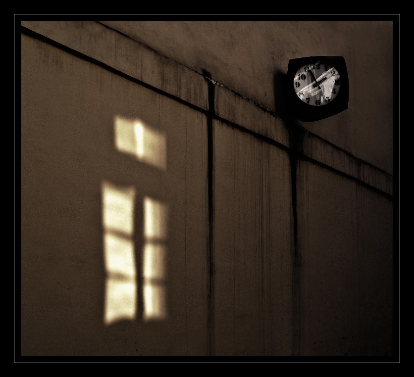 to Ivo Solnický : 3x: zrcadlení okna ..za pár okamžiků zmizí, hodiny ..za minutku už ručičky nebudou svírat totožný úhel, zeď ..pomalu, ale jistě chátrá ..