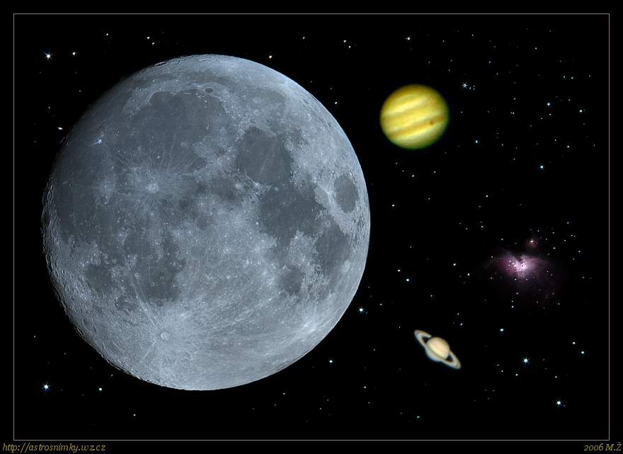 Mesic je slozena mozajka, Jupiter a Saturn jsou slozene z nekolika desitek az stovek snimku z videosekvenci, mlhovina M42 v Orionu je slozenina z 10ti snimku a hvezdokupa M45 (Plejady) je z 20ti snimku zaregistrovanych pres sebe pro eliminaci sumu a zvyrazneni slabsich partii. Bohuzel 15s pri iso 800 je na ne dost malo a lepsi fotak nemam :o)