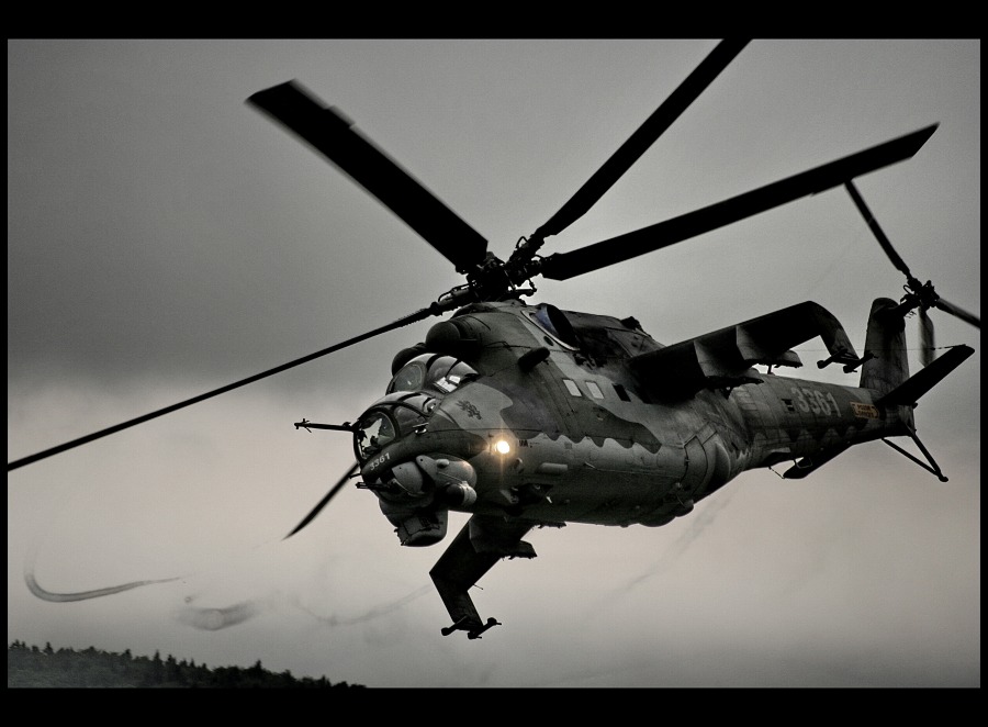 aby som to upresnil s tymi smuhami.Je to bezna vec. Oni sa vytvárajú vtedy, ak je vysoka vlhkost vzduchu cize nie len za dazda... Takych Mi-24-riek som sa uz nafotil... :) Inac fotka pekna, ale rotor mohol byt rozmazany dlhsim casom..