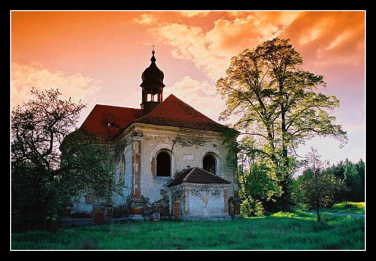 nemůžu si pomoct, ale ta oranžová obloha mi to posouvá do kýče. Ovšem ten kostelík se stromy je tak nádherný, že si jej snažím představit v čb.