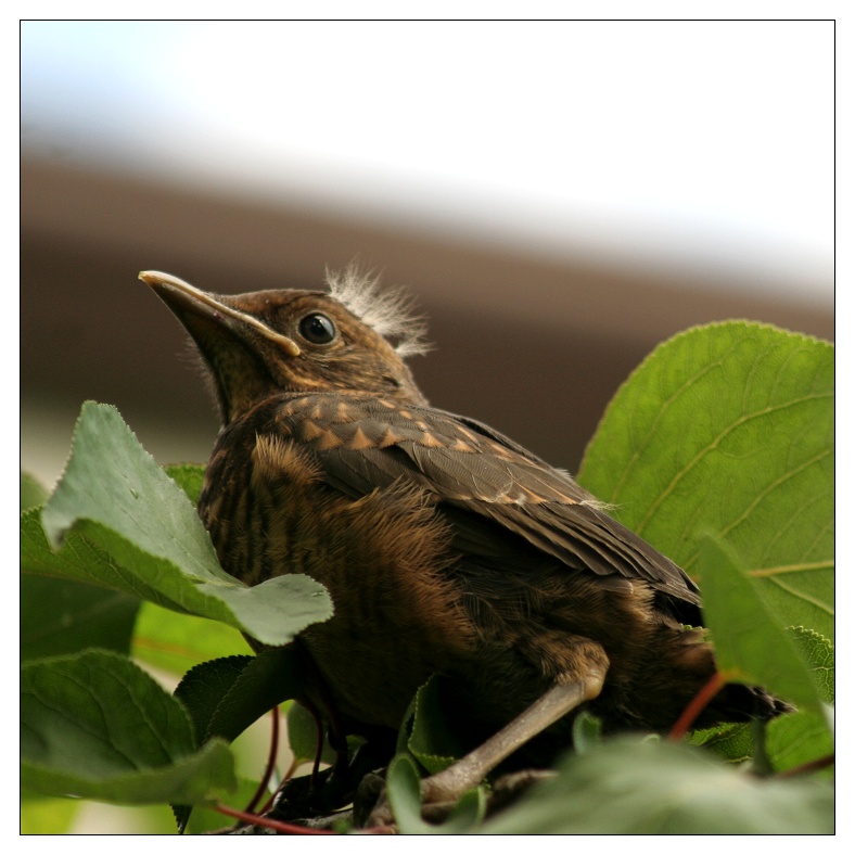 ak ty 2 mláďata vylétla v pátek večer,bohužel noc přežilo jen jedno. Zpátky do hnízda se nevrátili,ale přes den se včera občas objevilo. Dnes ráno jsme byli mile překvapeni,že tohle přežilo další noc aniž by ho sousedovic kočky sežraly,jako jeho sourozence :-(. Snad už se tak nestane... foto je na meruňce před domem, pozadí bohužel lépe nešlo, je to kraj střechy a obloha