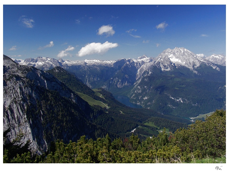 V pravé části je vidět druhá nejvyšší hora Německa - Watzmann (2713 m.n.m.) a pod ním jezero Königssee.