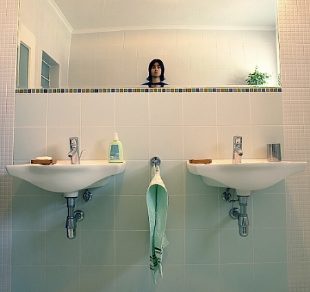 dal by som prec tu nadobu na tekute mydlo na lavom umyvadle. uvazujem aj o tom kvietku co sa odraza napravo dole v zrkadle. a mozno zrovnat zvisle linie. prehanam :) pekny napad inak.