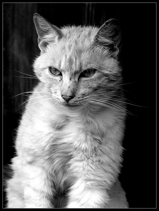 Celkem slušná kočičí fotka, decentně přeostřená (vidno na vousech).