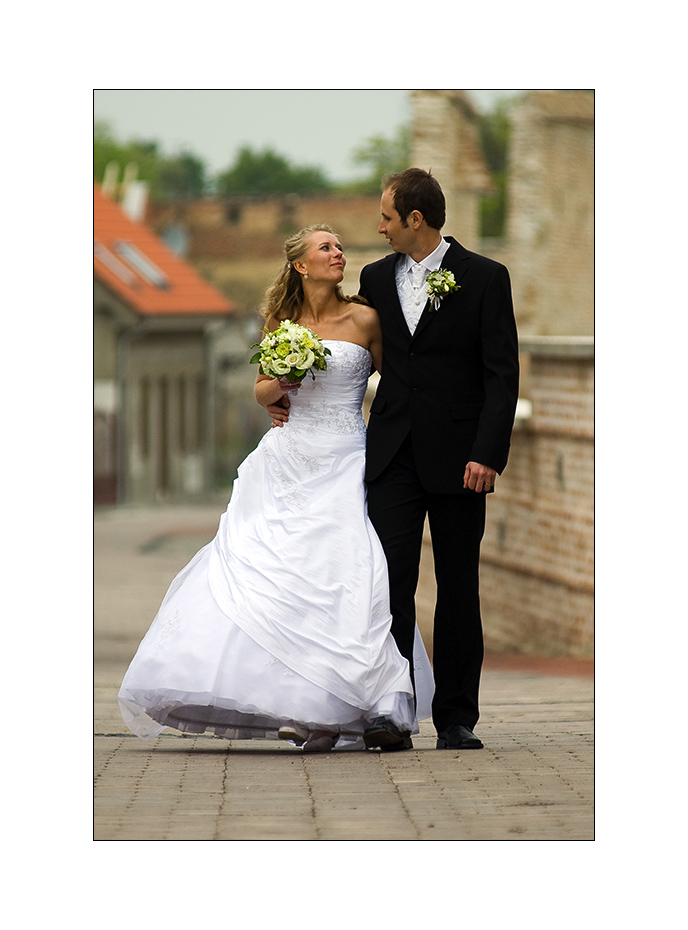 Fotka je focená teleobjektivem - tipuji, že z podřepu. Takže nic moc pohodlná poloha k focení. Přesto jsi si ohlídal hloubku ostrosti a výborný moment. Navíc - v podstatě s naprosto přesným ostřením. Tedy - pokuď byl pár v pohybu. Líbí se mi, že co by novomanželé oba vykročili (ano, správně) pravou nohou. Líbí se mi i výraz v tvářích (obou).